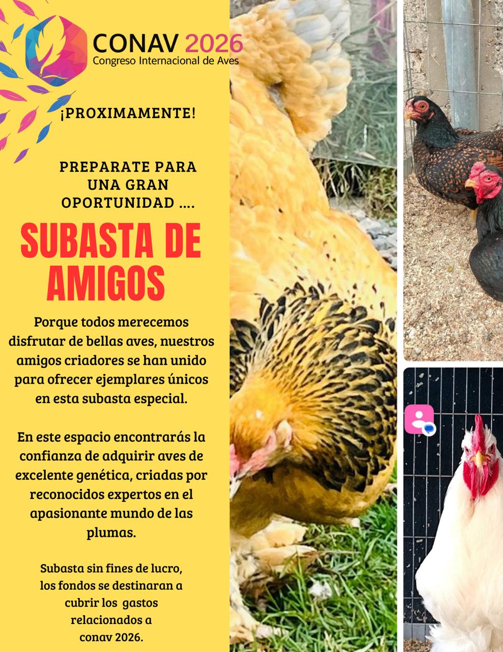 CONAV 2026Congreso Internacional de Aves ¡PRÓXIMAMENTE! PREPÁRATE PARA UNA GRAN OPORTUNIDAD… SUBASTA DE AMIGOS Porque todos merecemos disfrutar de bellas aves, nuestros amigos criadores se han unido para ofrecer ejemplares únicos en esta subasta especial. En este espacio encontrarás la confianza de adquirir aves de excelente genética, criadas por reconocidos…